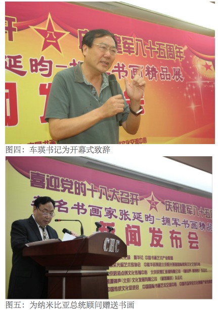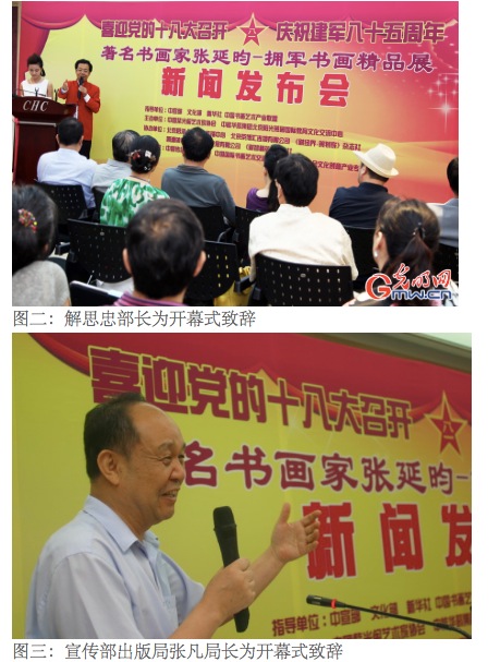 7月31日,由中宣部、文化部、新华社以及中国书画艺术产业联盟指导,中国民族书画研究院、中能华辰集团及旗下北京阳光燕园国际文化交流中心等机构共同主办,由北京启滔点创文化传播中心、北京茶博汇连锁有限公司等机构协办的《喜迎十八大,庆祝建军八十五周年“张延昀先生拥军书画作品展”》暨中能华辰集团与著名书画家张延昀签约仪式的新闻发布会,在中能华辰集团总部桑普大厦三层多功能厅召开。