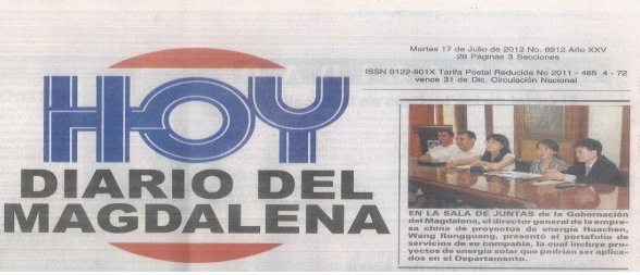 2012年7月15日至20日期间,中能华辰成套设备集团总经理王荣广、副总经理贾璐一行出访哥伦比亚,并于7月17日接受哥伦比亚玛格达雷娜省长的邀请,在省会议大厅双方进行了友好会谈,会谈中王荣广总经理主要介绍了公司的经营范围,其中包括可用于其省政府发展的太阳能新能源项目。双方会谈简报及照片刊登在玛格达雷娜省报报纸头版。